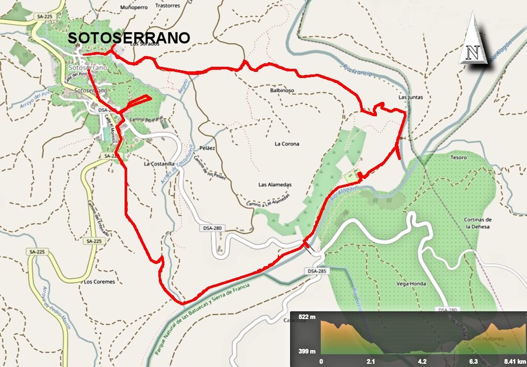 La ruta sale al encuentro de las desembocaduras de los rios Francia y cuerpo de hombre en el caudal del rÃo Alagón, el valle fluvial que recorre de norte a sur la Sierra de Francia para incorporarse al rÃo Tajo en tierras extremeñas.